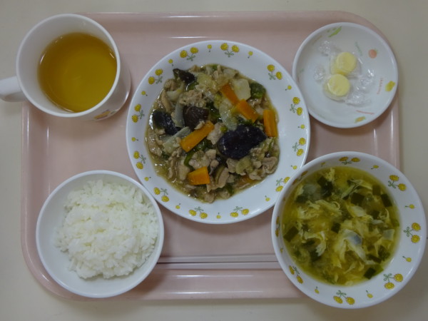 ごはん、中華コーンスープ、豚肉とナスの味噌炒め、チーズ・・・395kcal