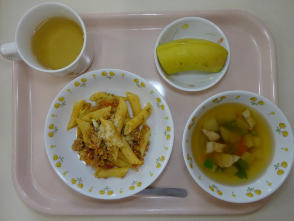 ペンネミートソース、かぶとベーコンのスープ、バナナ・・・443kcal
