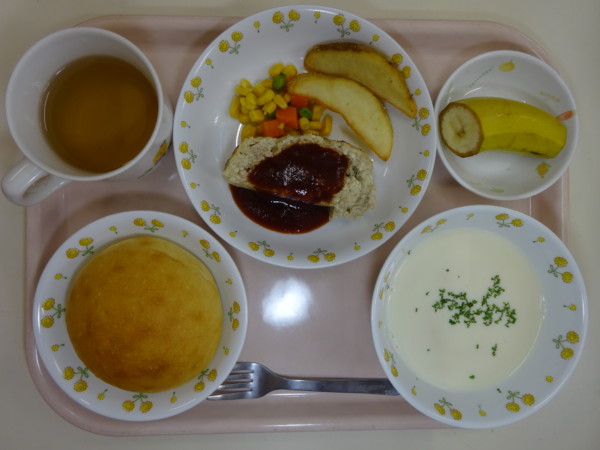 ロールパン、コーンスープ、ヘルシーミートローフ、フライドポテト、ミックス野菜ソテー、バナナ・・・464kcal