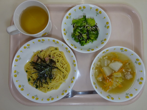 秋のきのこスパゲティ、里芋とお肉のスープ、ブロッコリーとじゃこのサラダ・・・290kcal