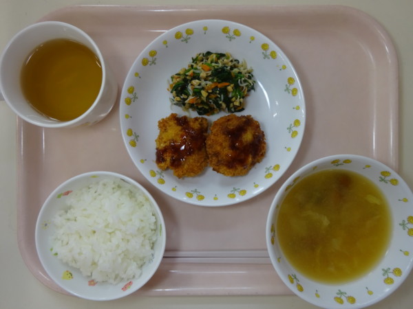 ごはん、味噌汁、とんかつ、青菜の納豆和え・・・355kcal