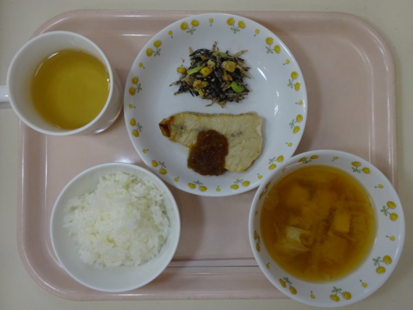 ごはん、味噌汁、魚のステーキソースかけ、ひじきの5色サラダ・・・337kcal