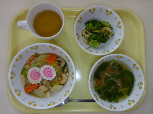 中華丼、ワンタン風スープ、ブロッコリーと竹輪の和え物・・・313kcal