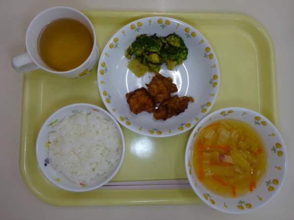 ごはん、白菜スープ、鶏のから揚げ、ブロッコリーの塩昆布和え・・・393kcal