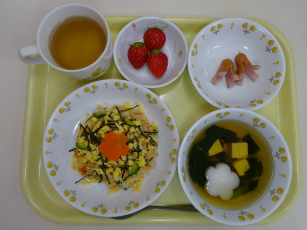 ちらし寿司、お吸い物、タコさんウインナー、いちご・・・313kcal