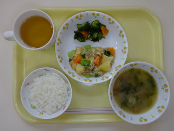 ごはん、味噌汁、生揚げのそぼろ煮、酢の物・・・361kcal