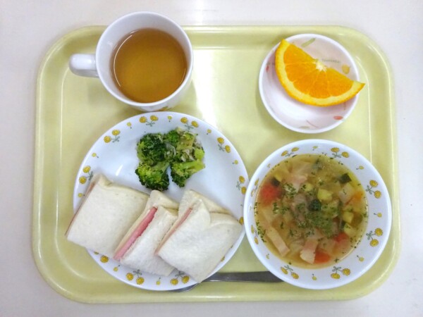 サンドイッチ、ミネストローネ、ブロッコリーとじゃこのサラダ、オレンジ・・・388kcal