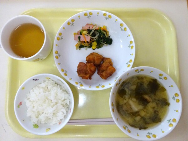 ごはん、味噌汁、鶏のから揚げ、青菜とハムの胡麻和え・・・360kcal