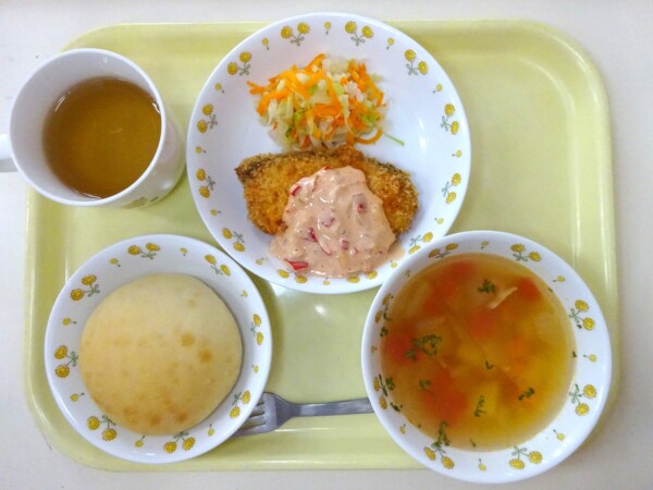 パン、ミネストローネ、魚のオーロラソースかけ、茹で野菜・・・392kcal