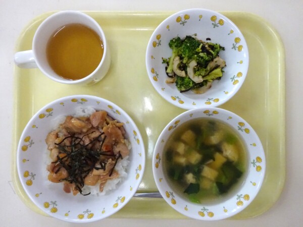 照り焼き丼、きつねスープ、ブロッコリーと竹輪の塩昆布和え・・・339kcal