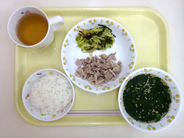 ごはん、お吸い物、豚肉の味噌焼き、キャベツと胡瓜の塩昆布和え・・・342kcal
