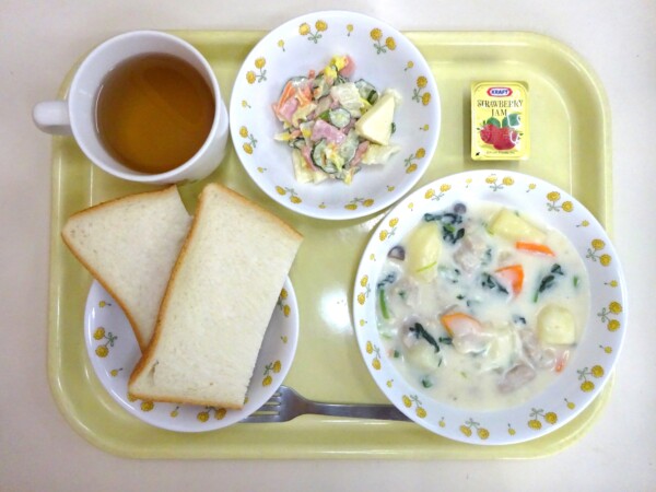 食パン、ジャム、鶏肉のクリーム煮、白菜とリンゴのサラダ・・・401kcal