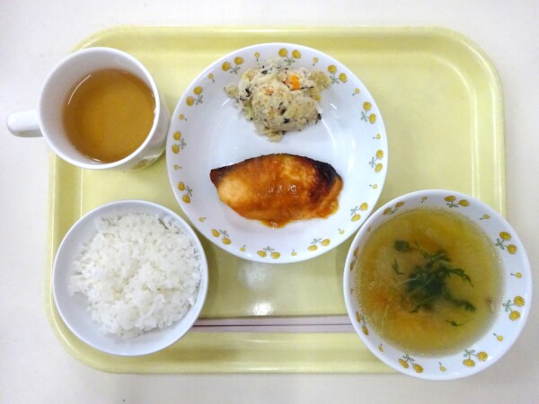 ごはん、冬瓜のスープ、鮭のマーマレード味噌焼き、和風ポテトサラダ・・・341kcal