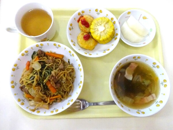 焼きそば、ナゲット、茹で野菜(とうもろこし)、野菜入りわかめスープ、梨・・・341kcal