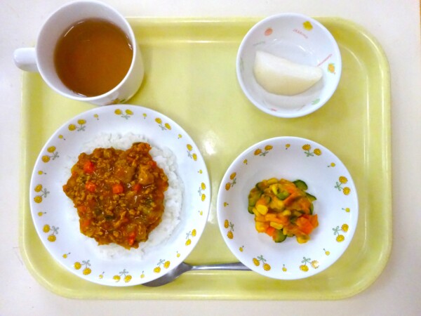 ごはん、ドライカレー、南瓜サラダ、梨・・・413kcal