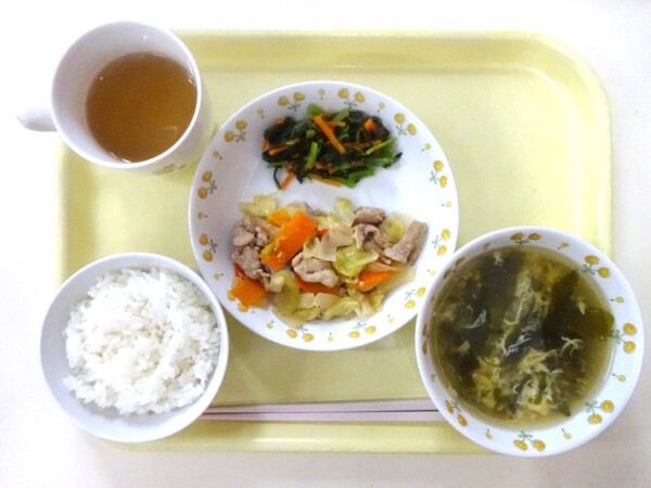 ごはん、卵のスープ、回鍋肉、小松菜のナムル・・・342kcal