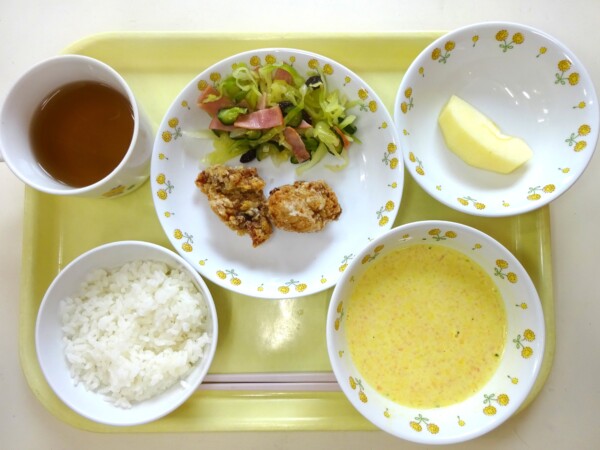 ごはん、鶏の唐揚げ、グリーンサラダ、南瓜のポタージュスープ、りんご・・・573kcal
