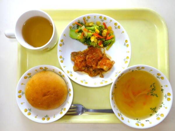 ロールパン、チキンのバーベキュー風、ブロッコリーのサラダ、オニオンスープ・・・434kcal