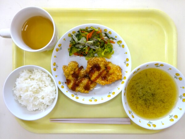 ごはん、チキンカツ、ゆかり和え、若竹汁・・・386Kcal