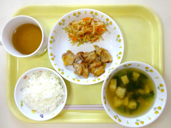 ごはん、鶏のマーマレード煮、もやしのナムル、きつねスープ・・・495kcal