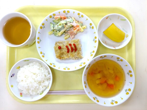 ごはん、こいのぼりバーグ、マカロニサラダ、オニオンスープ、バナナ・・・502kcal