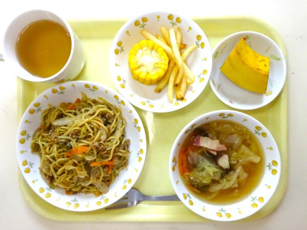 焼きそば、ポテトフライ、茹でとうもろこし、野菜入りわかめスープ、バナナ・・・516kcal