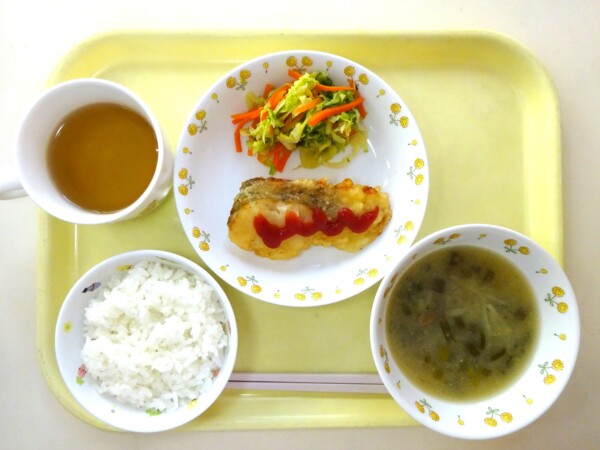 ごはん、味噌汁、たらのフリッター、即席漬け・・・443kcal
