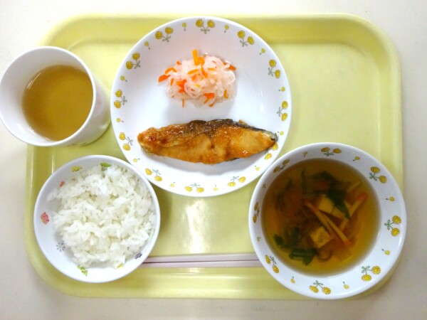 ごはん、鮭の西京焼き、紅白なます、お吸い物・・・518kcal