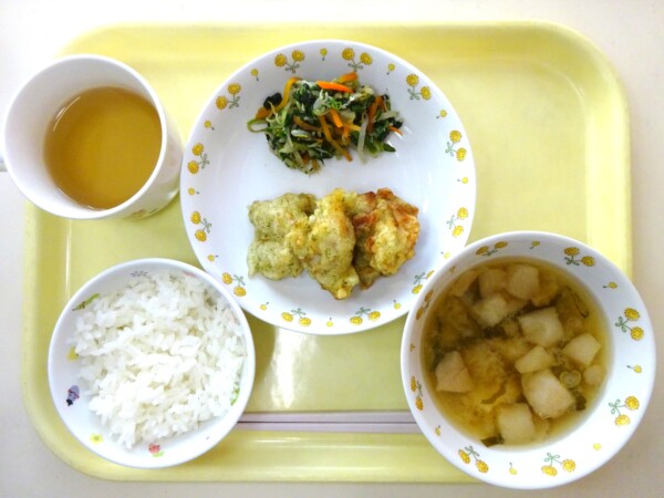 ごはん、味噌汁、のり塩とり天、ほうれん草とじゃこの和え物・・・571kcal