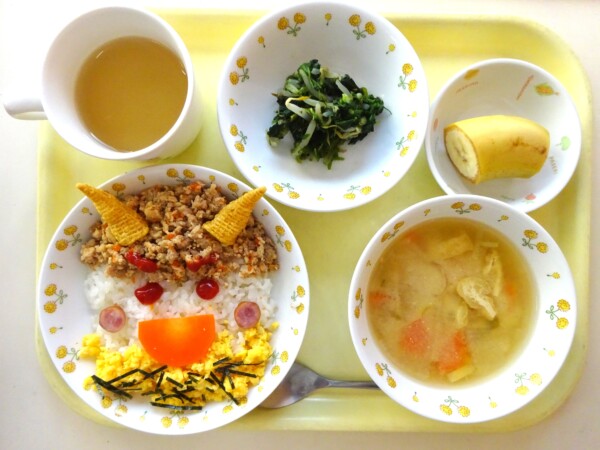 鬼そぼろごはん、おかか和え、呉汁、バナナ・・・787kcal