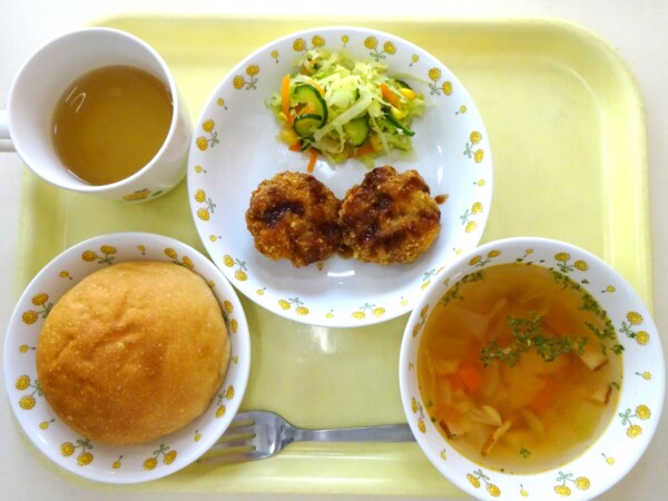 ロールパン、ミネストローネ、とんかつ、キャベツとコーンのサラダ・・・555kcal