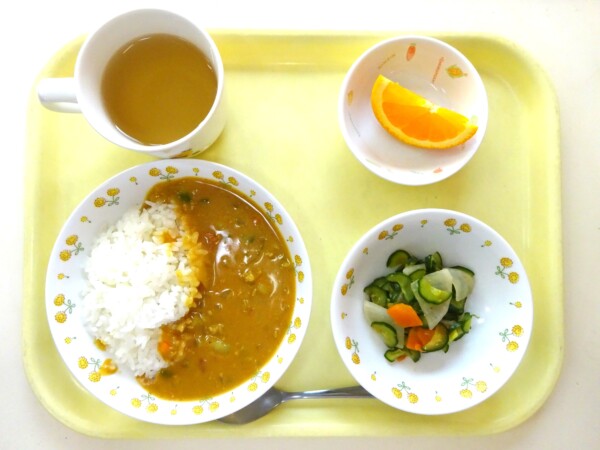 ごはん、キーマカレー、パリパリ漬け、オレンジ・・・555kcal