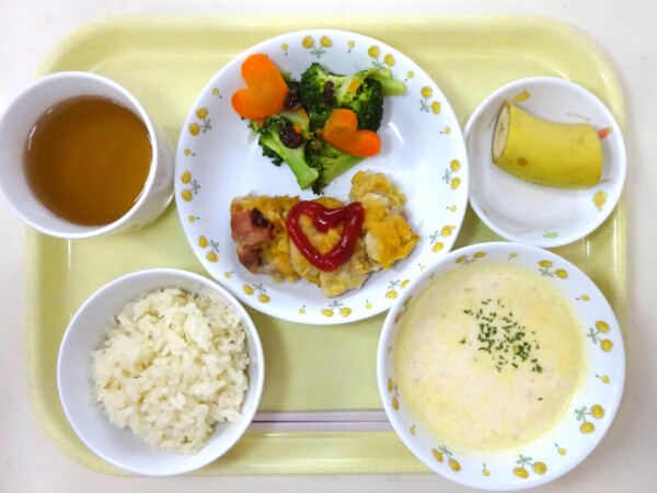 コンソメごはん、じゃがいものポタージュ、鶏肉のコーンピカタ、ブロッコリーのサラダ、バナナ・・・620kcal