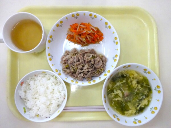 ごはん、豚の韓国風焼き、もやしのおかか和え、レタスと卵のスープ・・・492kcal
