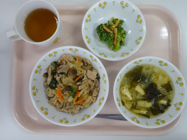 豚丼、味噌汁、ブロッコリー和え・・・389kcal