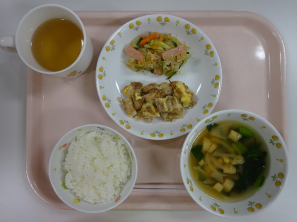 ごはん、きつねスープ、鶏のマヨネーズ焼き、春雨の酢の物・・・369kcal