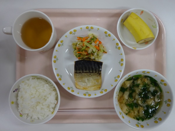 ごはん、お吸い物、鯖の塩焼き、キャベツの甘酢漬、バナナ・・・432kcal