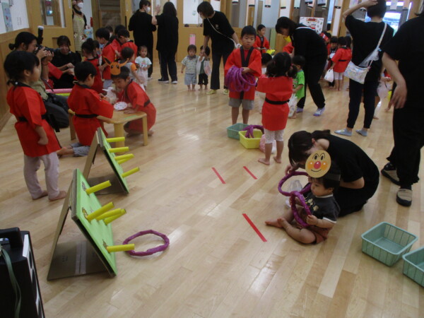 8月29日に上永谷西保育園では『夏祭り』が行われました。朝から園内はお祭りムード一色!子ども達の楽しそうな声が響き渡っていました。ぞう組ときりん組の子ども達が一緒に考えたお店屋さん『焼きとうもろこし』、『ジュース』『お面』『輪投げ』『金魚すくい』『ヨーヨー』などがオープンすると沢山のお客さんでホールは賑わっていました。子ども達は笑顔いっぱい楽しい時間を過ごしました。