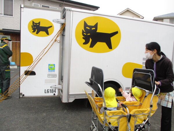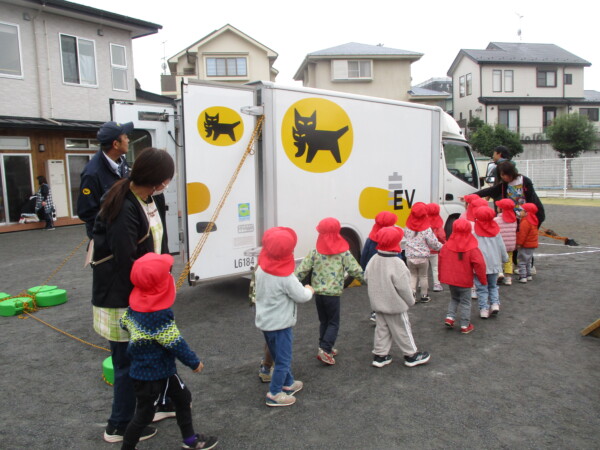 今日はヤマト運輸さんが来園し、交通安全教室を行ってくれました。園庭にトラックが入ってくると大喜びの子ども達!紙芝居でSDGsの取り組みで地球温暖化に伴いEV車の導入をしているお話や横断歩道の渡り方を教えてもらいました。トラックの周りを歩いたり、中の積荷置き場を見たり、運転席に座りハンドルに触って車窓からの景色を見たりを楽しんでいました。