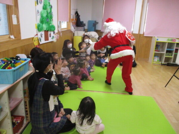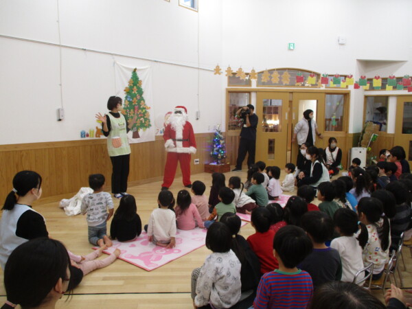 上永谷西保育園ではクリスマス会が行われました。乳児クラスさんが「あわてんぼうのサンタクロース」のパネルシアターを見ていると、サンタさんがプレゼント持って遊びに来てくれました。最初はびっくりした様子でしたが、サンタさんからプレゼントをもらうと可愛らしい笑顔がたくさん見られましたよ♪幼児クラスのお友達は〇×ゲームやぱんだ組の運動会でのダンス「チャオ!」をみんなで踊って楽しみました!お待ちかねのサンタさんも登場してクラスごとにプレゼントをもらいとても喜んでいた子ども達です♫