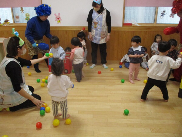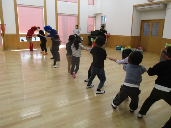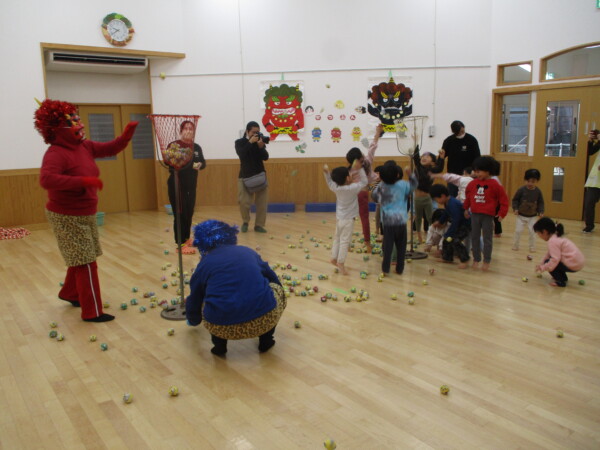 今日、上永谷西保育園では節分の行事が行われました。各クラスで節分の由来のお話を聞き無病息災を願いました。すると赤鬼と青鬼の姿が!!驚く様子も見られましたが、幼児クラスのお友達は玉入れや綱引きをして力比べをするとすっかり仲良しに♬一緒に記念の写真を撮り節分の会を楽しく過ごしました。小さいクラスは赤鬼、青鬼と一緒に車の箱へボール投げをして、最後は鬼と握手をする姿も見られましたよ。その後は豆の代わりに年の数のボーロを食べました。